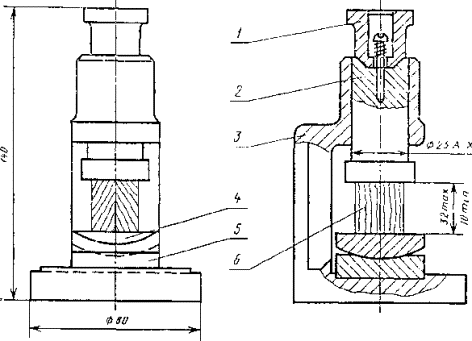 Постановлением Государственного комитета стандартов Совета Министров СССР от 23 октября 1973 г. № 2364 срок введения установлен с 01.07.74 Постановлением Госстандарта от 23.11.83 № 5486 срок действия продлен до 01.07.89 Настоящий стандарт распространяется на древесину и устанавливает методы определения предела прочности при сжатии вдоль волокон. Стандарт соответствует CT СЭВ 816-77 и МС ИCO 3787-76 в части определения предела прочности при сжатии вдоль волокон кондиционированных образцов. Методы не распространяются на авиационные пиломатериалы и заготовки. (Измененная редакция, Изм. № 2). 1. МЕТОД ОПРЕДЕЛЕНИЯ ПРЕДЕЛА ПРОЧНОСТИ ПРИ СЖАТИИ ВДОЛЬ ВОЛОКОНМетод предназначен для определения предела прочности древесины при кондиционировании образцов по ГОСТ 16483.0-78. машина испытательная по ГОСТ 7855-84 с погрешностью измерения нагрузки не более 1%; штангенциркуль по ГОСТ 166-80 с погрешностью измерения не более 0,1 мм; приспособление к испытательной машине (см. чертеж); аппаратура для определения влажности - по ГОСТ 16483.7-71. (Измененная редакция, Изм. № 1, 3). 1.2. Подготовка к испытанию 1.2.2. Точность изготовления, влажность и количество образцов должны соответствовать требованиям ГОСТ 16483.0-78. 1 - колпачок; 2 - пуансон; 3 - корпус; 4 - шаровая опора; 5 - плита; 6 - образец. 1.3. Проведение испытания 1.3.1. Размеры а и b поперечного сечения образца измеряют на середине длины с погрешностью не более 0,1 мм. 1.3.2. Образец помещают в приспособление для испытания на сжатие. Нагрузку на образец передают через пуансон 2. Образец нагружают равномерно с постоянной скоростью нагружения или постоянной скоростью перемещения нагружающей головки машины. Скорость должна быть такой, чтобы образец разрушился через (1,0±0,5) мин после начала нагружения. При использовании машины с электромеханическим приводом допускается проводить нагружение образца равномерно со скоростью (25000±5000) Н/мин или проводить испытание при скорости перемещения нагружающей головки испытательной машины 4 мм/мин при условии достижения предела прочности при сжатии вдоль волокон в указанный интервал времени. Максимальную нагрузку Р измеряют с погрешностью не более 1 %. (Измененная редакция, Изм. № 1,3). 1.3.3. После испытаний определяют влажность образцов в соответствии с требованиями ГОСТ 16483.7-71. Пробой для определения влажности является весь образец. Минимальное количество испытываемых на влажность образцов должно соответствовать ГОСТ 16483.0-78. (Измененная редакция, Изм. № 1). 1.4. Обработка результатов 1.4.1. Предел прочности древесины при кондиционировании образцов (sW) в МПа вычисляют по формуле