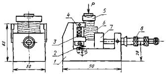 радиальной плоскости 2.2. Точность изготовления, влажность и количество образцов для каждого направления действия нагрузки должны соответствовать требованиям ГОСТ 16483.0-78. При определении минимального количества образцов коэффициент вариации предела прочности при скалывании поперек волокон принимают равным 20 %. 3. ПРОВЕДЕНИЕ ИСПЫТАНИЯ3.1. Длину выступа образца l и высоту h измеряют с погрешностью не более 0,1 мм. 3.2. Образцы испытывают с помощью приспособления (см. черт. 1). Перемещением подвижной опоры 7 обеспечивают прилегание опорных граней образца к соответствующим поверхностям приспособления. Подвижная опора должна прижиматься к образцу с силой, равной 5 - 9 Н (до третьего щелчка трещотки микрометрического винта). Нагрузку на образец передают через нажимную призму 5 равномерно со скоростью 2000 ± 500 Н/мин. Допускается проводить испытания при скорости перемещения нагружающей головки испытательной машины 4 мм/мин. Испытание продолжают до разрушения образца. Максимальную нагрузку Pmax определяют с точностью до цены деления шкалы силоизмерителя. 3.3. После испытания определяют влажность образцов в соответствии с требованиями ГОСТ 16483.7-71. Пробой для определения влажности является большая часть разрушенного образца. Для определения средней влажности испытанных образцов допускается отбирать каждый четвертый образец, но не меньше трех. 4. ОБРАБОТКА РЕЗУЛЬТАТОВ4.1. Предел прочности τW образца с влажностью W в момент испытания вычисляют с точностью до 0,1 МПа по формуле