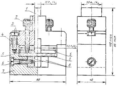 1 - подвижной нож; 2 - винт зажима образца; 3 - винт крепления крышки; 4 - крышка; 5 - зажимная планка; 6 - винт установки неподвижного ножа; 7 - корпус; 8 - неподвижный нож; 9 - образец При определении минимального количества образцов коэффициент вариации предела прочности при перерезании поперек волокон принимают равным 20 %. 3. ПРОВЕДЕНИЕ ИСПЫТАНИЯ3.1. Размеры a и b поперечного сечения образца измеряют на середине длины с погрешностью не более 0,1 мм. 3.2. Образцы испытывают с помощью приспособления, изображенного на чертеже. Приподняв подвижной нож 1, образец, вставляют в прорезь и зажимают винтами 2. Образец нагружают равномерно со скоростью 10000 ± 2000 Н/мин. Допускается проводить испытания при скорости перемещения нагружающей головки испытательной машины 10 мм/мин. Испытание продолжают до разрушения образца. Максимальную нагрузку Pmax определяют с точностью до цены деления шкалы силоизмерителя. 3.3. После испытания определяют влажность образцов в соответствии с требованиями ГОСТ 16483.7-71. Пробой для определения влажности является весь образец. Для определения средней влажности испытанных образцов допускается отбирать каждый четвертый образец, но не меньше трех. 4. ОБРАБОТКА РЕЗУЛЬТАТОВ4.1. Предел прочности τW образца с влажностью W в момент испытания вычисляют с точностью до 0,1 МПа по формуле