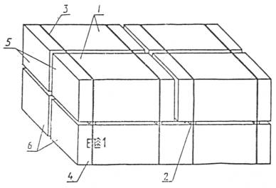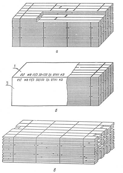 Настоящий стандарт распространяется на транспортные пакеты и блок-пакеты пилопродукции из древесины хвойных и лиственных пород, изготовляемые для нужд народного хозяйства и для экспорта, и устанавливает требования к их пакетированию, маркировке, транспортированию и хранению. Стандарт не распространяется на пакеты из обапола, из деталей деревянной тары, из авиационных пиломатериалов и заготовок. Определение терминов, применяемых в стандарте, приведено в приложении 1. 1. ПАКЕТИРОВАНИЕ1.1. Форма и размеры пакета и блок-пакета 1.1.1. Пакет и блок-пакет пилопродукции должны быть прямоугольного поперечного сечения и иметь один или оба выровненных торца (черт. 1-3). 1 - ряд; 2 - стопа; 3 - прокладка; 4 - обвязка; 5 - ярлык; 6 - маркировка Черт. 1 Допускается применение пакета с уступчатой формой одного торца (черт. 1 в, г). 1 - маркировка; 2 - обертка Черт. 2 При железнодорожных перевозках пилопродукции для заполнения верхней суженной части железнодорожного габарита погрузки допускается применять пакеты трапециевидного сечения. При формировании блок-пакета в нижний ряд укладывают длинные пакеты, укладывание коротких пакетов производится только в верхних рядах (черт. 3). (Измененная редакция, Изм. № 3). 1 - пакеты; 2 - прокладка; 3 - обвязка; 4 - маркировка; 5 - верхний ряд пакетов; 6 - нижний ряд пакетов Черт. 3 1.1.2. Размеры поперечного сечения пакетов и блок-пакетов - по ГОСТ 16369-88. 1.1.3. Длина пакета и блок-пакета определяется максимальной длиной пиломатериалов, из которых они формируются. 1.2. Состав пакета и блок-пакета 1.2.1. В пакет должна быть уложена пилопродукция одного сорта, одной ширины и толщины. Примечание. Пиломатериалы, относящиеся к группе бессортных, считают за один сорт. Породный состав укладываемой в пакет пилопродукции должен соответствовать требованиям стандартов на эту пилопродукцию. С согласия потребителя допускается укладывание в пакет пилопродукции разных сортов и ширин при условии сохранения одинаковой ширины всех рядов в пакете. 1.2.2. В пакет укладывают пилопродукцию не более четырех смежных длин. Допускается укладывать в пакет пилопродукцию со стыкованием по длине. При этом в крайние стопы и два-три нижних ряда пакета укладывают пилопродукцию максимальной длины без стыкования. При формировании пакета со стыкованием по длине из тонких пиломатериалов в один - два нижних ряда укладывают пиломатериалы толщиной 32 мм и более. В средней части крайних стоп, кроме двух-трех верхних и нижних рядов, допускается через ряд укладывать пиломатериалы и заготовки со стыкованием по длине (черт. 2а, в). При формировании пакета пиломатериалов, вырабатываемых по ГОСТ 26002-83 и ГОСТ 9302-83, стыкование по длине не допускается. При пакетировании пиломатериалов для экспорта в пакеты должны укладываться пиломатериалы одной длины. По согласованию с внешнеторговым объединением допускается укладывание в пакет пиломатериалы двух или трех смежных длин. (Измененная редакция, Изм. № 3). 1.2.3. Блок-пакет должен состоять из пакетов одинаковой ширины и высоты, принадлежащих к одной отгрузочной партии. 1.2.4. При пакетировании пилопродукции толщиной 32 мм и более в пакетах высотой 850 мм и более должно быть два ряда прокладок, укладываемых через 1/3 высоты, в пакетах высотой менее 850 мм - один ряд прокладок, укладываемых через 1/2 высоты; при пакетировании пилопродукции толщиной менее 32 м