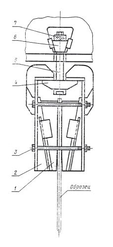 1 - губка; 2 - скоба; 3 - болт; 4 - основание; 5 - тяга; 6 - сухарь; 7 - гайка