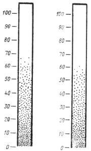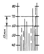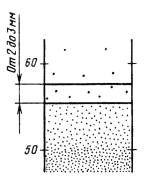 (Измененная редакция, Изм. № 1). 2. ПОДГОТОВКА К ИСПЫТАНИЮ2.1. Отбор проб испытуемого материала - по ГОСТ 9980.2-86. Степень перетира определяют в неразбавленных лакокрасочных материалах, если нет других указаний в нормативно-технической документации на испытуемый материал. 2.2. Температуру испытуемого материала и тщательно промытого и высушенного прибора «Клин» (гриндометра) перед испытанием доводят до (20 ± 2) °С. 2.3. Прибор «Клин» (гриндометр) пригоден к работе, если при наложении лезвия скребка перпендикулярно к измерительной поверхности плиты и небольшом отклонении от этого положения не обнаруживается просвет между кромкой лезвия и поверхностью плиты на фоне сильного источника света, установленного за прибором «Клин» (гриндометром). Проверку повторяют при повороте лезвия на 180°. 2.1 - 2.3. (Измененная редакция, Изм. № 1). 3. ПРОВЕДЕНИЕ ИСПЫТАНИЯ3.1. Степень перетира грунтовок, эмалей и готовых к применению красок определяют по границе видимых частиц и агломератов на поверхности слоя испытуемого материала. 3.2. Степень перетира густотертых и водоэмульсионных красок, а также шпатлевок определяют по границе начала штрихов, если нет других указаний в нормативно-технической документации на испытуемый материал. 3.3. Измерительную плиту прибора «Клин» (гриндометра) устанавливают на горизонтальную поверхность. Испытуемый материал тщательно перемешивают и помещают за верхний предел шкалы прибора в количестве, достаточном для заполнения всего паза, избегая при этом попадания пузырьков воздуха. Скребок устанавливают перпендикулярно к измерительной поверхности и к длине паза за помещенным в пазе испытуемым материалом. С небольшим нажимом скребок перемещают под углом 90° по измерительной поверхности с равномерной скоростью за время не более 3 с от максимального значения шкалы за нуль, при этом паз должен быть полностью заполнен слоем испытуемого материала, а измерительная поверхность должна остаться чистой. 3.4. Поверхность слоя испытуемого материала сразу же осматривают на свету при направлении взгляда перпендикулярно длине паза, под углом зрения 20-30°, и за время не более 6 с определяют положение границы видимых частиц и агломератов или начала штрихов. Определяют показание шкалы прибора, соответствующее этой границе. 3.1 - 3.4. (Измененная редакция, Изм. № 1). 3.6. Границу видимых частиц и агломератов определяют по положению верхнего края полосы шириной 2 – 3 мм, на которой видны от 5 до 10 частиц и агломератов. Отдельные частицы и агломераты, расположенные вне границы основного количества этих частиц, не учитываются (способ А). Графическое изображение оценки результатов указано на черт. 3. (Измененная редакция, Изм. № 1). 3.7. Границу начала штрихов, расположенных в направлении от большего деления шкалы к 0, определяют по месту появления третьего непрерывного штриха, доходящего по глубине до металла, если нет других указаний в нормативно-технической документации на испытуемый материал (способ Б). Отдельный непрерывный штрих, начинающийся на расстоянии более 15 мм от других штрихов, во внимание не принимают. Графическое изображение оценки результатов указано на черт. 4. Способы оценки результатов (А или Б) устанавливают в нормативно-технической документации на испытуемый материал. 3.8. Проводят не менее четырех определений, причем первоопределение служи