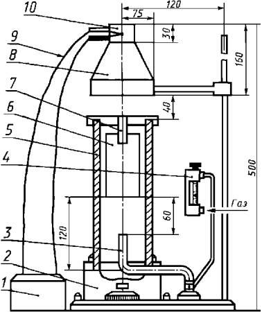 3 Постановлением Государственного комитета Российской Федерации по стандартизации, метрологии и сертификации от 25 сентября 1998г. № 357 межгосударственный стандарт ГОСТ 16363-98 введен в действие непосредственно в качестве государственного стандарта Российской Федерации с 1 июля 1999г. 4 Взамен ГОСТ 16363-76 1 Область примененияНастоящий стандарт распространяется на средства огнезащитные для древесины и устанавливает классификационный метод и метод ускоренных испытаний для определения огнезащитных свойств. Сущность методов заключается в определении потери массы древесины, обработанной испытываемыми покрытиями или пропиточными составами, при огневом испытании в условиях, благоприятствующих аккумуляции тепла. Классификационный метод применяют для определения группы огнезащитной эффективности и при проведении сертификационных испытаний. Метод ускоренных испытаний применяют для контроля огнезащитной эффективности средств огнезащиты, прошедших классификационные испытания. 2 Нормативные ссылкиВ настоящем стандарте использованы ссылки на следующие стандарты: ГОСТ 745-79 Фольга алюминиевая для упаковки. Технические условия ГОСТ 2140-81 Видимые пороки древесины. Классификация, термины и определения, способы измерения ГОСТ 5106-77 Цинк азотнокислый 6-водный. Технические условия ГОСТ 7164-78 Приборы автоматические следящего уравновешивания ГСП. Общие технические условия ГОСТ 13045-81 Ротаметры. Общие технические условия ГОСТ 20448-90 Газы углеводородные сжиженные топливные для коммунально-бытового потребления. Технические условия 3 Аппаратура и материалыДля проведения испытания применяют следующие аппаратуру и материалы. Установка для определения огнезащитной эффективности покрытий и пропиток (рисунок 1), состоящая из: Весы с погрешностью взвешивания не более 0,1 г. Секундомер. Газ по ГОСТ 20448. Фольга алюминиевая толщиной 0,014 0,018 мм марки ФГ по ГОСТ 745. Шкаф или камера для термостатирования, обеспечивающие диапазон температур от 40 до 60°С с принудительной циркуляцией воздуха и кратностью воздухообмена (Кв) в пределах 4-8. Вытяжной шкаф с принудительной вентиляцией. Прибор для определения влажности воздуха. Электровлагомер типа ЭВ-2К с пределами измерения 7-22% (для измерения влажности образцов древесины). Емкость для пропитки образцов древесины. Пульверизатор. Кисти, шпатели для нанесения красок, покрытий. Эксикатор. Цинк азотнокислый 6-водный по ГОСТ 5106. Установка для определения огнезащитной эффективности покрытий и пропиток. 1 - потенциометр КСП-4; 2 - металлическая подставка; 3 - газовая горелка; 4 - ротаметр; 5 - керамический короб; 6 - образец; 7 - держатель образца; 8 - зонт; 9 - термоэлектрические преобразователи; 10 - верхний патрубок зонта Для проведения испытания применяют следующие аппаратуру и материалы. Установка для определения огнезащитной эффективности покрытий и пропиток (рисунок 1), состоящая из: керамического короба 5 внешним размером 120х120х300 мм и толщиной стенок (16±2) мм; - металлической подставки 2 для крепления керамического короба, которая с боковых сторон имеет створки для регулирования подачи воздуха в зону горения материала; - газовой горелки 3, входящей внутрь керамического короба по его центру с отклонением по оси не более 2 мм; - ротаметра 4 типа РМ по ГОСТ 13045 с пределами измерения расхода газа 20, 100 л/ч; - держателя образца 7, фиксиру