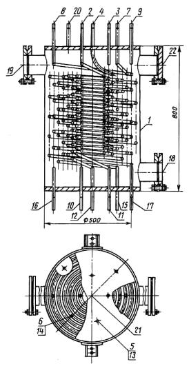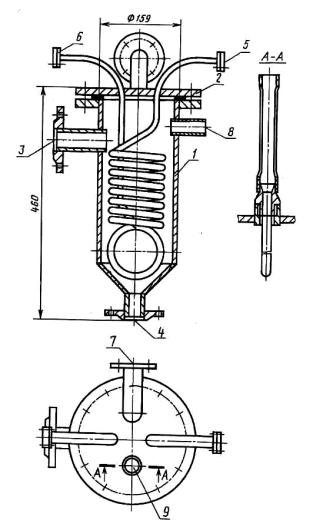 2. Пробоотборное устройство (черт. 1), предназначенное для отбора проб питательной воды из аппаратов и коммуникаций, представляет собой цилиндрический сосуд с встроенным холодильником и рядом штуцеров.