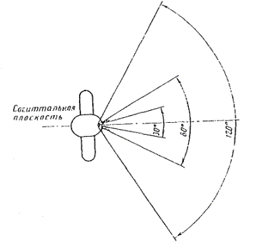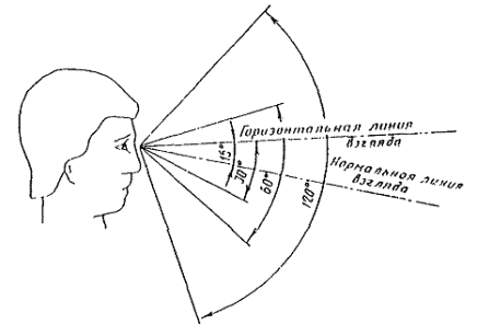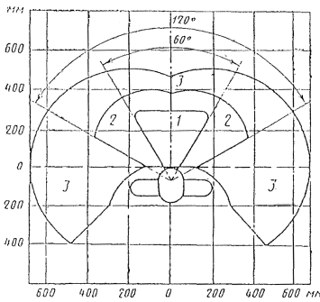 2.6. Форму рабочей поверхности различного оборудования следует устанавливать с учетом характера выполняемой работы. Она может быть прямоугольной, иметь вырез для корпуса работающего или углубление для настольных машин и т.д. При необходимости на рабочую поверхность следует устанавливать подлокотники. 2.7. Подставка для ног должна быть регулируемой по высоте. Ширина должна быть не менее 300 мм, длина - не менее 400 мм. Поверхность подставки должна быть рифленой. По переднему краю следует предусматривать бортик высотой 10 мм. 3. ТРЕБОВАНИЯ К РАЗМЕЩЕНИЮ ОРГАНОВ УПРАВЛЕНИЯ3.1. Общие требования к размещению органов управления – по ГОСТ 22269-76. 3.2. При работе двумя руками органы управления размещают с таким расчетом, чтобы не было перекрещивания рук. 3.3. Органы управления на рабочей поверхности в горизонтальной плоскости необходимо размещать с учетом следующих требований: очень часто используемые и наиболее важные органы управления должны быть расположены в зоне 1 (черт. 3); часто используемые и менее важные органы управления не допускается располагать за пределами зоны 2 (черт. 3); редко используемые органы управления не допускается располагать за пределами зоны 3 (черт. 3). 3.4. При размещении органов управления в вертикальной плоскости следует руководствоваться данными, приведенными в табл. 1 и на черт. 1 и 4. Выше 1100 мм органы управления допускается размещать в случае, если по техническим причинам расположить их до указанного уровня невозможно. Такие органы управления должны быть использованы редко. 3.5. Аварийные органы управления следует располагать в зоне досягаемости моторного поля, при этом необходимо предусмотреть специальные средства опознавания и предотвращения их непроизвольного и самопроизвольного включения в соответствии с ГОСТ 12.2.003-74. Зоны зрительного наблюдения в вертикальной плоскости Черт. 6 3.6. При необходимости освобождения рук операции, не требующие точности и быстроты выполнения, могут быть переданы ножным органам управления. 4. ТРЕБОВАНИЯ К РАЗМЕЩЕНИЮ СРЕДСТВ ОТОБРАЖЕНИЯ ИНФОРМАЦИИ4.1. Общие требования к размещению средств отображения информации - по ГОСТ 22269-76. 4.2. Очень часто используемые средства отображения информации, требующие точного и быстрого считывания показаний, следует располагать в вертикальной плоскости под углом ± 15° от нормальной линии взгляда и в горизонтальной плоскости под углом ±15° от сагиттальной плоскости (черт. 6 и 7). 4.3. Часто используемые средства отображения информации, требующие менее точного и быстрого считывания показаний, допускается располагать в вертикальной плоскости под углом ±30° от нормальной линии взгляда и в горизонтальной плоскости под углом ±30° от сагиттальной плоскости. Зоны зрительного наблюдения в горизонтальной плоскости Черт. 7 Примечание. Для стрелочных индикаторов допускаемый угол отклонения от нормальной линии взгляда - по ГОСТ 22269-76. 4.4. Редко используемые средства отображения информации допускается располагать в вертикальной плоскости под углом ±60° от нормальном линии взгляда и в горизонтальной плоскости под углом ±60° от сагиттальной плоскости (при движении глаз и повороте головы). ПРИЛОЖЕНИЕСправочное Термин и определение
