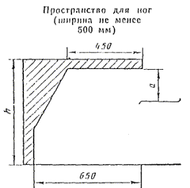 2.4.1. Конструкция регулируемого кресла оператора должна соответствовать требованиям ГОСТ 21889-76. 2.5. В тех случаях, когда невозможно осуществить регулирование высоты рабочей поверхности и подставки для ног, допускается проектировать и изготовлять оборудование с нерегулируемыми параметрами рабочего места. В этом случае числовые значения этих параметров определяют по табл. 1, 2 и черт. 5. а - расстояние от сиденья до нижнего края рабочей поверхности не менее 150 мм, h - высота пространства для ног не менее 600 мм Черт. 5 Таблица 2