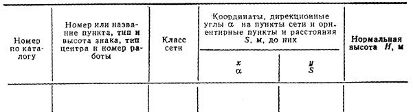 ______________________ (место и год издания) (Измененная редакция, Изм. № 1). 1. ПОЯСНЕНИЕ 1.1. Общие сведения 1.1.1. В каталоге помещены координаты геодезических пунктов, определенных в 1933-1968 гг. Плановые координаты x, у приведены в Системе 1942 г. для 6-й шестиградусной зоны (средний меридиан 33° от Гринвича). Нормальные высоты приведены в Балтийской системе 1977 г. 1.1.2. В каталог включены: «Список координат пунктов государственной геодезической сети» и «Список координат пунктов геодезических сетей сгущения» (основные списки), а также «Список координат пунктов государственной геодезической сети на полосу перекрытия» и «Список координат пунктов геодезических сетей сгущения на полосу перекрытия». Геодезические пункты сгруппированы в списках по листам карты масштаба 1:50000. В пределах каждого листа они расположены по убывающим значениям абсцисс х. Для пунктов, расположенных к востоку от граничного меридиана 30° в полосе протяжением 30′ по долготе, координаты х, у приведены дважды: в основных списках от среднего меридиана 6-й зоны (33°) и в списках на полосу перекрытия от среднего меридиана 5-й зоны (27°). Номера пунктов по каталогу в списках на полосу перекрытия те же, что в основных списках. 1.1.3. В «Список координат пунктов государственной геодезической сети» включены пункты триангуляции 1-го класса (работы № 1 и 2) и пункты геодезических сетей 2, 3, 4-го классов, развитые в соответствии с «Основными положениями 1954-1961 гг.» (работы № 3-5). Номера по каталогу пунктов государственной геодезической сети 2-го класса, на которых средние квадратические ошибки дирекционных углов превышают допустимые значения, приведенные в табл. 1, отмечены знаком «*». В «Список координат пунктов геодезических сетей сгущения» включены триангуляции II, III, IV классов, развитые в соответствии с «Основными положениями 1939 г.» (работы № 6 и 7), пункты триангуляции 3-го класса г. __________________ (работа № 8), пункты триангуляции 1 разряда и специальных геодезических сетей (работы № 9 и 10). 1.1.1, 1.1.2, 1.1.3. (Измененная редакция, Изм. № 1). 1.1.4. Для части геодезических пунктов из-за отсутствия данных некоторые сведения не приведены. (Введен дополнительно, Изм. № 1). 1.2. Перечень геодезических работ № 1 - базисная сеть триангуляции 1-го класса (лист карты N-36-2-A), развитая в 1933 г. Всесоюзным трестом основных геодезических и гравиметрических работ. № 2 - звено триангуляции 1-го класса (листы карт N-36-1-А, Г; 2-В, Г), проложенное в 1934 и 1936 гг. Предприятием № 11 ГУГК. № 3 - триангуляция 2, 3-го классов и полигонометрия 3-го класса в районе (листы карт N-36-1; 2-А, В), выполненные в 1967 и 1968 гг. Предприятием № 14 ГУГК. № 4 - триангуляция 2, 3, 4-го классов объекта (листы карты N-36-2-Б, В, Г; 14-А, В), развитая в 1960 г. Предприятием № 8 ГУГК. № 5 - триангуляция 2, 3-го классов г. Энск (лист карты N-36-1-Г), развитая в 1966 г. Государственным институтом проектирования городов. Пункты триангуляции 2, 3-го классов переклассифицированы соответственно в пункты 3, 4-го классов государственной геодезической сети. № 9 - триангуляция 1 разряда на объекте (листы карты N-36-13-А, Б), развитая в 1963 г. Энским краевым земельным управлением. № 10 - специальная геодезическая сеть (СГС-30), развитая в 1967 г. (лист карты N-32-2-А) частями Топографической службы Вооруженных Сил СССР. (Измененная редакция, Изм. № 1). 1.3. Сведения о точности геодезических сетей 1.3.1. Точность государственных геодезических сетей в предела