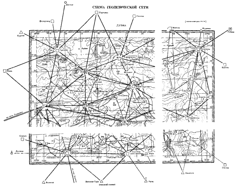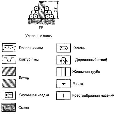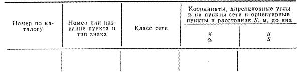 1.6.3. Высоты геодезических знаков указаны, как правило, от верхней части 1 центра до верха визирного цилиндра. Если размеры знака приведены между другими точками, то это указано под значениями высот знаков. Для вновь построенных наружных знаков (вместо утраченных более высоких) приведены два значения высоты; высота прежнего знака указана в скобках. 1.6.2, 1.6.3. (Измененная редакция, Изм. № 1). 1.7. Сведения о дирекционных углах и сторонах 1.7.1. В «Списке координат пунктов государственной геодезической сети» для каждого пункта приведены дирекционные углы и длины сторон для всех измеренных с него направлений на пункты сети равного и высшего класса и ориентирные пункты. Для некоторых пунктов государственной геодезической сети приведены значения сближения меридианов, которые помещены перед значениями дирекционных углов и подчеркнуты. 1.7.2. В «Списке координат пунктов геодезических сетей сгущения» дирекционные углы и длины сторон для направлений, измеренных в сети, приведены только на пунктах триангуляции II, III и IV классов работы № 6. 1.7.3. Рядом с названиями пунктов, принятых за ориентирные, в графе «Дирекционные углы» указано: (ориент. пункт). ЧЕРТЕЖИ ЦЕНТРОВ