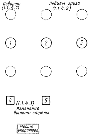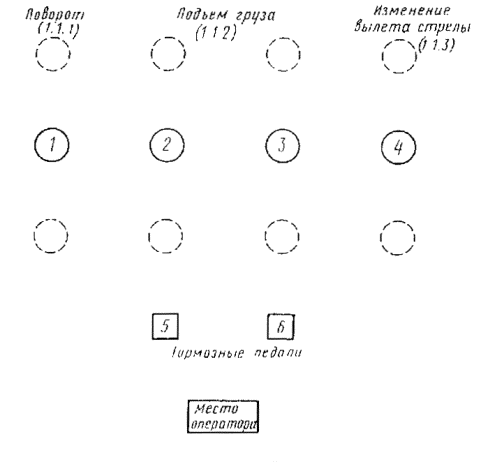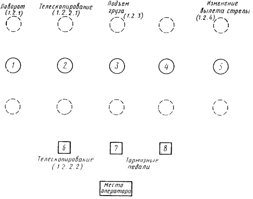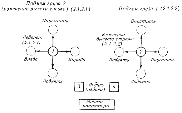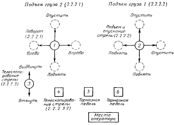 Дата введения 01.01.89 Настоящий стандарт распространяется на стреловые самоходные краны и устанавливает требования к схеме расположения, направлению движения основных органов управления поворотом, подъемом и опусканием груза, изменением вылета стрелы и телескопированием. Допускаются схемы расположения и направление движения основных органов управления, отличающиеся от требований настоящего стандарта, для кранов, серийное производство которых начато до 01.01.89 г. (Измененная редакция, Изм. № 1). 1. ДВУХХОДОВЫЕ ОРГАНЫ УПРАВЛЕНИЯ. ОСНОВНОЕ РАСПОЛОЖЕНИЕ И НАПРАВЛЕНИЕ ДВИЖЕНИЯ1.1. Кран со стрелой постоянной длины Основные органы управления должны быть расположены, как показано на черт. 1. Схема управления краном, снабженным стрелой постоянной длины Черт. 1 1.1.1. Для управления поворотом с помощью ручного рычага 1 необходимо: подать рычаг вперед - поворот в сторону стрелы (при рабочем месте оператора справа от стрелы - поворот влево, а при рабочем месте оператора слева от стрелы или в центре крана - поворот вправо); перевести рычаг в нейтральное положение для отключения поворота; потянуть рычаг назад для изменения движения в противоположном направлении. 1.1.2. Для управления подъемом груза с помощью ручного рычага 2 и ножной педали 5, ручного рычага 3 и ножной педали 6 необходимо: потянуть рычаг назад для подъема груза; перевести рычаг в нейтральное положение для отключения привода для удержания груза в данном положении (если кран снабжен автоматическим тормозом) или контролировать груз путем нажатия тормозной педали: подать рычаг вперед для опускания груза. Схема управления краном, снабженным стрелой постоянной длины, и дополнительный вариант расположения органов управления изменением вылета стрелы (ножные педали) Черт. 2 1.1.3. Для управления изменением вылета стрелы с помощью ручного рычага 4 необходимо: потянуть рычаг назад для подъема стрелы; перевести рычаг в нейтральное положение для удержания стрелы в данном положении; подать рычаг вперед для опускания стрелы. 1.1.4. Для управления изменением вылета стрелы применяют дополнительный вариант расположения (работа педалью). Основные органы управления должны быть расположены, как показано на черт. 2. 1.1.4.1. Для управления поворотом с помощью ручного рычага 1 необходимо: подать рычаг вперед - поворот в сторону стрелы (при рабочем месте оператора справа от стрелы - поворот влево, а при рабочем месте оператора слева от стрелы или в центре крана - поворот вправо); перевести рычаг в нейтральное положение для отключения привода поворота; потянуть рычаг назад для изменения движения в противоположном направлении. 1.1.4.2. Для управления подъемом груза с помощью ручного рычага 2 и 3 необходимо: потянуть рычаг назад для подъема груза; перевести рычаг в нейтральное положение для отключения привода и удержания груза; подать рычаг вперед для опускания груза. 1.1.4.3. Для управления изменением вылета стрелы с помощью ножной педали 4 и 5 необходимо: нажать педаль 4 для подъема стрелы; нажать педаль 5 для опускания стрелы; отпустить педаль 4 и 5 для удержания стрелы в неподвижном положении. 1.2. Кран с телескопической стрелой Основные органы управления крапом должны быть расположены, кик показано на черт. 3. 1.2.1. Для управления поворотом с помощью рычага 1 необходимо: подать рычаг вперед - поворот в сторону стрелы (при р