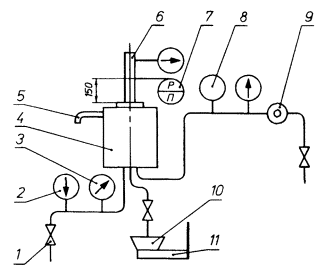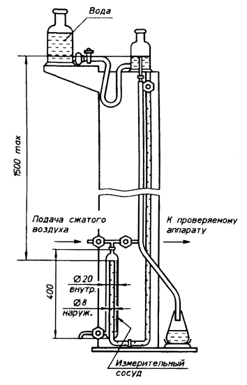 где f - норматив утечки в соответствии с требованиями п. 5.5.17.1, дм3/ч; t - длительность испытаний, с; V - объем полости, находящейся под испытательным давлением, мм3; d - внутренний диаметр мановакуумметра, мм. При определении герметичности газовых коммуникаций объемным методом с помощью счетчика пузырьков воздуха время утечки одного пузырька (7) в секундах вычисляют по формуле