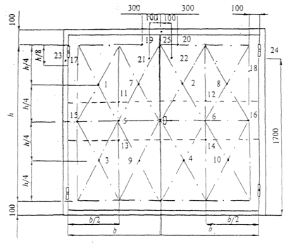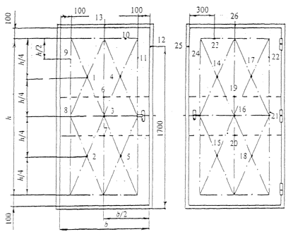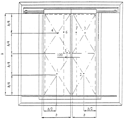 Рисунок AI - Схема установки термоэлектрических преобразователей 2.5 Приспособление с образцом устанавливают в проеме печи. Тепловое воздействие на образец двери должно быть со стороны, обращенной к посадочной (погрузочной) площадке. 2.6 Дверь шахты должна испытываться в закрытом состоянии и запертой на замок в соответствии с требованиями ПУБЭЛ. 2.7 Установку термоэлектрических преобразователей (термопар) для измерения температуры необогреваемой поверхности производят в соответствии со схемой, приведенной на рисунке АI: а) посередине всей площади двери, но не совпадающей с местами расположения притвора полотен, ребер жесткости или сквозных деталей (термопара 5); б) посередине каждой четверти площади двери, но не совпадающей с местами расположения ребер жесткости или сквозных деталей (термопары 1 - 4); в) против ребер жесткости, если таковые имеются (термопары 6, 7). 3 Предельные состояния 3.1 При испытании дверей шахт лифтов различают следующие предельные состояния. 3.1.1 Потеря целостности Е - по 9.1.1. 3.1.2 Потеря теплоизолирующей способности I вследствие повышения температуры на необогреваемой поверхности полотна двери в среднем более чем на 280 °С или в любой точке этой поверхности на 330 °С в сравнении с температурой конструкции до испытания. 4 Оценка результатов испытаний 4.1 Потерю целостности определяют по 9.1.1. 4.2 Потеря теплоизолирующей способности: 4.2.1 Величину превышения первоначальной температуры на необогреваемой поверхности двери на 280 °С определяют как среднеарифметическое значение показаний термопар, установленных в точках, указанных в 2.7 а и б настоящего приложения. 4.2.2 Величину превышения первоначальной температуры на необогреваемой поверхности двери на 330 °С определяют по показаниям термопар, установленных в точках, указанных в 2.7 а, б, в настоящего приложения. 4.3 За предел огнестойкости принимают минимальное значение времени наступления предельных состояний. 5 Дополнительные данные для внесения в отчет (протокол) испытания 5.1 Сведения о представителе заказчика (производителя), присутствовавшем при проведении испытаний. 5.2 Инструкция производителя по проведению монтажа испытываемой двери шахты лифта.