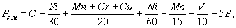 где С, Si, Mn, Cr, Mo, V, Ni, Сu, В - массовые доли в стали соответственно углерода, кремния, марганца, хрома, молибдена, ванадия, никеля, меди, бора, %. При расчете Сэкв и Рс.м медь, никель, хром, содержащиеся в сталях как примеси, не учитывают, если их суммарное содержание не превышает 0,20 %, при расчете Рс.м не учитывают бор при его содержании менее 0,001 %. По согласованию между изготовителем и потребителем могут быть установлены другие значения Сэкв и Рс.м». Пункт 5.9. Второй абзац изложить в новой редакции: «Максимальные