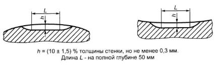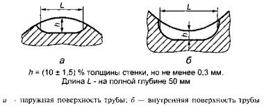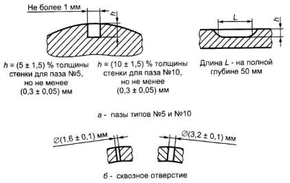 Рисунок В.2 - Виды искусственных дефектов Приложение Г (наименование) и пункт Г.2. Заменить слова: «токо-вихревой метод» на «вихретоковый метод»; пункт Г.3 изложить в новой редакции: «Г.3 При выявлении дефектов сплошности сварного шва искусственные дефекты в СОП изготовляют в виде продольного паза на внутренней и наружной поверхностях образца непосредственно в сварном соединении (рисунки Г.1 и Г.2). Контроль основного металла труб типа 1 на наличие поперечных дефектов проводят по требованию потребителя. При выявлении дефектов сплошности основного металла сварных труб искусственные дефекты в СОП в виде: - продольного и поперечного пазов на внутренней и наружной поверхностях образца (рисунки Г.1 - Г.5); - сквозного отверстия в стенке образца (рисунок Г.6). Размеры искусственных дефектов в контрольных образцах для прямоугольных пазов: - глубина (высота) h устанавливается равной (10 ± 1,5) % толщины стенки трубы; - ширина т - не более 0,5 мм; - длина L - не более 50 мм. Размеры искусственных дефектов в контрольных образцах для сквозных отверстий: - диаметр d - не более 3,2 мм».