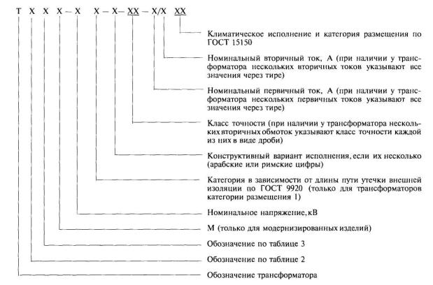 4.1.2 По принципу конструкции: опорные, проходные, шинные, встроенные, разъемные. Допускается сочетание в конструкции трансформатора нескольких перечисленных признаков, а также специальное конструктивное исполнение. 4.1.3 По виду изоляции: с литой изоляцией, с фарфоровой покрышкой, в пластмассовом корпусе, с твердой изоляцией (кроме фарфоровой и литой) или с полимерной покрышкой, маслонаполненные, газонаполненные. 4.1.4 По числу ступеней трансформации: одноступенчатые, каскадные. 4.1.5 По числу вторичных обмоток: с одной вторичной обмоткой, с несколькими вторичными обмотками. 4.1.6 По назначению вторичных обмоток: для измерения и учета, для защиты1), для измерения и защиты, для работы с нормированной точностью в переходных режимах. _________ 1) Здесь и далее под словом «защита» подразумевается защита, автоматика, управление и сигнализация. 4.1.7 По числу коэффициентов трансформации: с одним коэффициентом трансформации, с несколькими коэффициентами трансформации, получаемыми путем изменения числа витков первичной или (и) вторичной обмотки, а также путем применения нескольких вторичных обмоток с различными числами витков, соответствующих различным значениям номинального вторичного тока. 4.1.8 Признаки по 4.1.2, 4.1.3, 4.1.4, 4.1.6 и их обозначения приведены в таблицах 2 - 4. Таблица 2