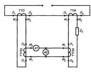 ТТО - образцовый трансформатор тока; ТТИ - испытуемый трансформатор тока; ТТПИ - промежуточный трансформатор тока, находящийся в цепи испытуемого трансформатора тока; ТТПО - промежуточный трансформатор тока, находящийся в цепи образцового трансформатора тока; А1, А2 - амперметры; Z2 - вторичная нагрузка в цепи испытуемого трансформатора тока К элементам схемы предъявляют следующие требования: а) коэффициенты трансформации трансформаторов ТТПО и ТТПИ должны быть такими, чтобы выполнялось условие