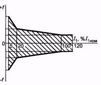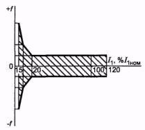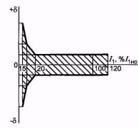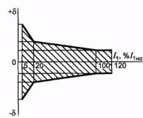 6.4 Метрологические характеристики 6.4.1 Метрологические характеристики следует устанавливать для следующих рабочих условий применения трансформаторов: а) частота переменного тока (50 ± 0,5) Гц или (60 ± 0,5) Гц; б) первичный ток - в соответствии с 6.4.2 и 6.4.3; в) значение вторичной нагрузки - в соответствии с 6.4.2 и 6.4.3; г) температура окружающего воздуха - в соответствии с климатическим исполнением и категорией размещения, если иное не указано в стандартах на трансформаторы конкретных типов; д) высота установки трансформаторов над уровнем моря - по 6.2.2. 6.4.2 Пределы допускаемых погрешностей вторичных обмоток для измерений и учета в рабочих условиях применения по 6.4.1 при установившемся режиме должны соответствовать значениям, указанным в таблице 8. Погрешности не должны выходить за пределы допускаемых областей. Допускаемые области погрешностей для различных классов точности приведены в приложении Б. Для трансформаторов с номинальными вторичными нагрузками 1; 2; 2,5; 3; 5 и 10 В·А нижний предел вторичных нагрузок - 0,8; 1,25; 1,5; 1,75; 3,75 и 3,75 В·А соответственно.