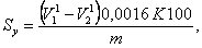 где V1 - объем раствора йода молярной концентрации c(1/2I2) = 0,05 моль/дм3 (0,05 н.), израсходованного на титрование пробы, см3; V2 - объем раствора йода молярной концентрации c(l/2I2) = 0,05 моль/дм3 (0,05 н.), израсходованного на титрование холостой пробы, см3; К - коэффициент поправки к концентрации 0,05 моль/дм3 раствора йода; m - масса волокна, взятого для анализа, г; W - фактическая влажность штапельного волокна или жгута, %, определенная по ГОСТ 10213.3 для лабораторной пробы, отобранной по 6.1; 0,0016 - титр 0,05 моль/дм3 раствора йода по сере, г/см3. Вычисления проводят до четвертого десятичного знака с последующим округлением до третьего десятичного знака при определении массовой доли серы менее 0,08 % и до третьего десятичного знака с округлением до второго десятичного знака при определении массовой доли серы более 0,08 %. За результат принимают среднеарифметическое значение результатов двух параллельных определений. 8.2 Массовую долю свободной серы при определении по ускоренному методу Sу, %, вычисляют по формуле