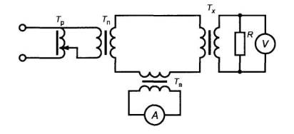 Tp - регулирующее устройство (автотрансформатор); Тп - понижающий силовой трансформатор; Tx - поверяемый трансформатор тока; Tв - вспомогательный трансформатор тока; R - резистор Рисунок 1 - Пример схемы размагничивания трансформатора тока 9.3.2 У трансформаторов тока с несколькими вторичными обмотками, каждая из которых размещена на отдельном магнитопроводе, размагничивают каждый магнитопровод. Допускается размагничивание различных магнитопроводов выполнять одновременно. 9.3.3 Трансформаторы тока размагничивают одним из указанных ниже способов. Первый способ. Вторичную обмотку замыкают на резистор мощностью не менее 250 Вт и сопротивлением R, Ом, рассчитываемым (с отклонением в пределах ±10 %) по формуле