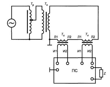~ - сеть (генератор); Тр - регулирующее устройство (автотрансформатор); Тп - понижающий силовой трансформатор; То - рабочий эталон; Тх - поверяемый трансформатор тока; Л1, Л2 - контактные зажимы первичной обмотки; И1, И2 - контактные зажимы вторичной обмотки; Z - нагрузка; ПС - прибор сравнения Рисунок 3 - Схема поверки с использованием рабочего эталона и прибора сравнения (компаратора вторичных токов)