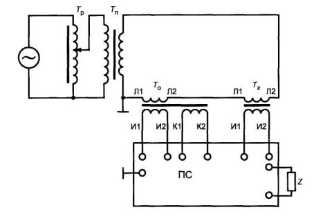 ~ - сеть (генератор); Тр - регулирующее устройство (автотрансформатор); Тп - понижающий силовой трансформатор; Тх - поверяемый трансформатор тока; Л1, Л2 - контактные зажимы первичной обмотки, И1, И2 - контактные зажимы вторичной обмотки; Z - нагрузка; ПС - прибор сравнения типа К-535 Рисунок 2 - Схема поверки с использованием компаратора первичного и вторичного токов
