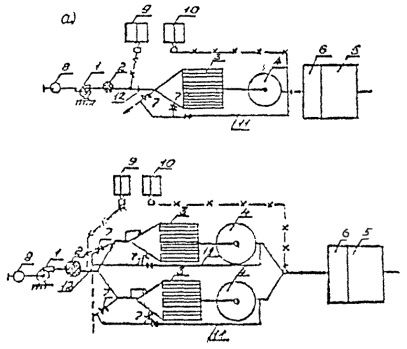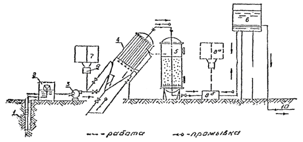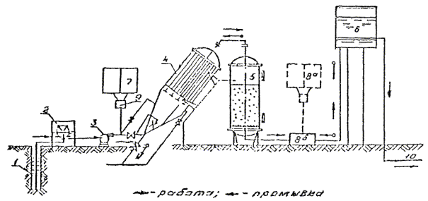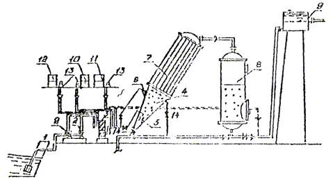 где Qрасч - расчетная производительность установки при обесфторивании, обезжелезивании или умягчении воды, м3/сут; Qпов - производительность в расчете на условия очистки поверхностных вод, м3/сут; Кот - коэффициент относительного изменения производительности установок по сравнению с типовой для случая очистки поверхностных вод. УСТРОЙСТВО И ПРИНЦИП ДЕЙСТВИЯ УСТАНОВОК В РЕЖИМЕ ОЧИСТКИ ПОВЕРХНОСТНЫХ ВОД4. Схема работы и технологическое решение водоочистной установки изображены на рис. 1. Исходная вода забирается из водоисточника насосами 2 и подается на установку. Раствор коагулянта и щелочи (кальцинированной соды) в требуемых дозах (выбранных на основании пробных лабораторных испытаний) вводится в напорный патрубок насоса до или после сетчатого фильтра. Обеззараживающий раствор хлорреагента вводится в фильтрованную воду, а при необходимости также и в исходную воду. В случае ввода флокулянта полиакриламида (ПАА) он дозируется после сетчатого фильтра, а коагулянт - до него. Реагенты смешиваются с обрабатываемой водой в напорном трубопроводе до камеры хлопьеобразования, в рециркуляторе. Для задержания крупных плавающих примесей после насоса устанавливают сетчатый фильтр 3. Пройдя его, вода поступает в камеру хлопьеобразования 4, в которой после ввода коагулянта образуются хлопья гидрата окиси алюминия с извлечениями из воды взвешенными частицами. Затем образовавшиеся в камере хлопья поступают в отстойник 7, в трубках в межтрубном пространстве которого происходит выпадение взвеси, и вода интенсивно осветляется. Одновременно часть осадка сползает в камеру хлопьеобразования. Отстоянная вода с остаточной мутностью проходит фильтр 8, где происходит ее окончательная очистка. Рис. 1. Схема осветления воды на установках «Струя-М» при очистке поверхностных вод: 1 - поверхностный водозабор; 2 - насосы исходной воды; 3 - сетчатый фильтр; 4 - камера хлопьеобразования; 5 - рециркулятор; 6 - диффузор; 7 - трубчатый отстойник; 8 - фильтр подщелачивания; 9 - водонапорная башня; 10 - блок коагулирования; 11 - блок обеззараживания; 12 - блок подщелачивания; 13 - насосы-дозаторы; 14 - операционные зажимы 12. Емкости водонапорных башен должны быть рассчитаны на регулирующий и промывной объемы. Регулирующий объем определяют конкретными условиями работы системы водоснабжения. Промывной объем рассчитывают на одну промывку 4 - 5 м3 для установок производительностью 100 и 200 м3/сут., 16 - 20 м3 для установок производительностью 400 - 800 м3/сут. При этом конструкция узлов подвода воды от установки к башне должна обеспечивать необходимые продолжительность и интенсивность промывки установки. Рис. 2. Технологическая схема установок типа «Струя-М» а - с одним отстойником и фильтром; б - с двумя отстойниками и фильтрами; 1 - насос подачи воды; 2 - сетчатое устройство; 3 - отстойник; 4 - фильтр; 5 - бак водонапорной башни; 6 - промывной отсек; 7 - операционная задвижка; 8 - бак-аэратор; 9 - оборудование для коагулирования; 10 - оборудование для обеззараживания; 11 - обводная линия; 12 - смесительная диафрагма РАБОТА УСТАНОВОК В РЕЖИМЕ ОБЕЗЖЕЛЕЗИВАНИЯ, УМЯГЧЕНИЯ И ОБЕСФТОРИВАНИЯ ПОДЗЕМНЫХ ВОД13. Технологические схемы обезжелезивания, умягчения и обесфторивания воды на установках включают целый ряд аналогичных элементов (промежуточный аэрационный бак, оборудование для коагулирования, подщелачиван
