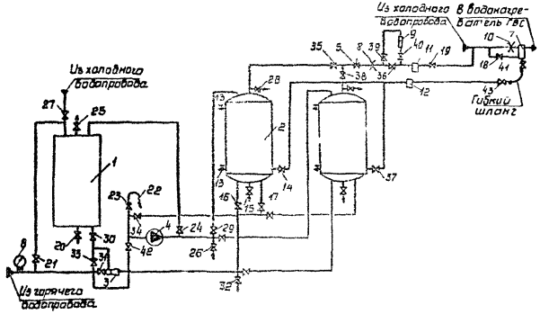 IV. ПРИНЦИП РАБОТЫ УСТАНОВКИ ДЛЯ ПРОТИВОКОРРОЗИОННОЙ ОБРАБОТКИ ВОДЫ СТЕКЛОМ ЖИДКИМ НАТРИЕВЫМ30. Плотность рабочего раствора жидкого стекла больше плотности воды, что обеспечивает возможность выдавливания его холодной водой из напорного бака 2 под действием перепада давления, создаваемого дроссельной диафрагмой 10. При этом скорости перемещения воды и рабочего раствора жидкого стекла крайне малы (порядка 0,01 м/ч), что позволяет избежать их смешения без применения разделительной перегородки. В период отсутствия расхода воды подача рабочего раствора силиката натрия в обрабатываемую воду не происходит. 31. Применение в схеме ограничительной калиброванной диафрагмы совместно с игольчатым вентилем позволяет, с одной стороны, избежать превышения максимальной концентрации силиката натрия, допускаемой санитарными нормами, а с другой, - регулировать концентрацию при необходимости ее уменьшения или увеличения. 32. Комплект оборудования обеспечивает возможность непрерывного дозирования стекла жидкого натриевого пропорционально расходу обрабатываемой воды, что значительно повышает эффективность силикатной обработки воды и соответственно увеличивает долговечность систем горячего водоснабжения и снижает эксплуатационные расходы. 33. Комплект оборудования позволяет производить дозирование силиката натрия в холодную воду, что обеспечивает защиту от коррозии не только трубопроводов, но и трубок водонагревателей и калачей. V. МОНТАЖ КОМПЛЕКТА ОБОРУДОВАНИЯ34. Для монтажа комплекты оборудования заводского изготовления поступают в виде следующих составных частей: бака хранения стекла жидкого натриевого; бака (баков) напорного для рабочего раствора силиката натрия с трубной обвязкой и арматурой; элеватора (водоструйного насоса) с обвязкой; насосного агрегата с обвязкой и арматурой; узла ввода, состоящего из устройства для ввода рабочего раствора силиката натрия 7, дроссельной диафрагмы 10, штуцера с вентилем для отбора воды, поступающей в верхнюю часть напорного бака, и гибкого шланга; узла ротаметра, состоящего из ограничительной калиброванной диафрагмы 6, игольчатого вентиля 5, фильтра 11, ротаметра 9, трубной обвязки и арматуры. Помимо перечисленных составных частей в составе комплекта оборудования поставляются трубы, предназначенные для соединения отдельных узлов и баков. Длина этих труб выбрана из условия минимально допустимого расстояния между отдельными составными частями. 35. В зависимости от планировки теплового пункта расстояние между составными частями может быть увеличено по сравнению с размерами, указанными в паспорте на комплект оборудования. 36. При размещении составных частей оборудования выполняются следующие условия: узел ввода устанавливают на высоте не более 1400 мм от пола ЦТП; выходящий из напорного бака трубопровод рабочего раствора стекла жидкого натриевого с установленным на нем фильтром 12 обязательно должен иметь подъем до верха напорного бака; узел ротаметра устанавливают на стене или специальных стойках таким образом, чтобы высота его нижней части от пола ЦТП составляла 700 мм; при необходимости выполнения трубной обвязки со спусками и подъемами следует в высших точках предусмотреть воздухоспускные краны, а в нижних - спускные; насосный агрегат следует оборудовать заземлением в соответствии с 