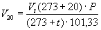 а - содержание циазида в хроматографируемом объеме пробы, найденное по градуировочному графику, мкг; б - объем пробы, взятой на хроматографирование, мл; в - общий объем анализируемого раствора, мл; V - объем воздуха, отобранного для анализа и приведенного к стандартным условиям, л (см. приложение 1). Приложение 1Приведение объема воздуха к стандартным условиямПриведение объема воздуха к стандартным условиям (температура 20 °С и давление 760 мм рт. ст.) проводят по формуле: