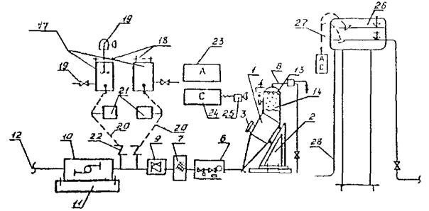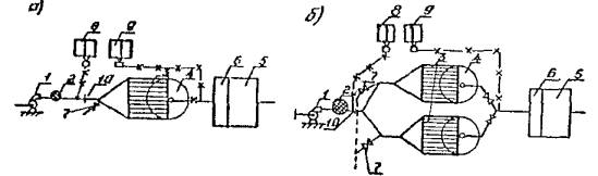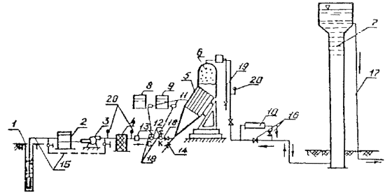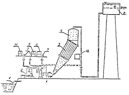 Перед вводом установок в эксплуатацию их необходимо дезинфицировать хлорной известью, гипохлоритом кальция или натрия. Хлорреагент вводят насосом-дозатором, снижая производительность установки для обеспечения дозы 25 - 30 мг/л по активному хлору. После 8-часового контакта воду сбрасывают в канализацию, дозу снижают до 3 - 4 мг/л и подают в водонапорную башню, от которой промывают установку. После получения благоприятных санитарно-бактериологических показателей установку можно включить в постоянную эксплуатацию. 21. Перед пуском установки в эксплуатацию необходимо тщательно ознакомиться с инструкциями по эксплуатации всех элементов, входящих в ее состав. ЭКСПЛУАТАЦИЯ УСТАНОВОК22. Во время эксплуатации установки обслуживающий персонал приготавливает химические реагенты, следит за работой насосных агрегатов, периодически контролирует подачу требуемых доз реагентов, контролирует качество обработки воды, устраняет возникающие мелкие неполадки, т.е. поддерживает установку в рабочем состоянии. 23. Для приготовления раствора коагулянта в бак загружают необходимое количество реагента. Затем заливают воду так, чтобы уровень ее в баке был ниже верхней кромки бака на 15 см и закрепляют на нем электрическую мешалку. Время перемешивания раствора должно составлять около 20 - 30 мин. Для проверки эффективности перемешивания химическим методом определяют концентрацию приготовленного раствора. 24. Расход раствора реагента, подаваемого насосом-дозатором, равен qР = 0,19QДК(1/KР), где qР - расход раствора коагулянта, л/ч; Q - производительность установки, м3/ч; ДК - доза коагулянта по окиси алюминия, г/м3; KР - концентрация раствора коагулянта по окиси алюминия. 25. Перед включением в работу насоса-дозатора необходимо дать возможность раствору отстояться в течение 15 мин. После отстаивания раствора надо проверить состояние фильтрующего элемента в баке, через который происходит всасывание раствора реагента насосом-дозатором. В случае необходимости его нужно прочистить или промыть водой. Требуемую производительность насоса-дозатора устанавливают вращением установочного кольца на устройстве изменения длины хода поршня в соответствии со шкалой, выраженной в л/ч или в процентном отношении от максимальной производительности насоса. Регулировку можно производить как при работающем, так и при неработающем насосе. 26. Введение щелочных реагентов (извести, соды) в обрабатываемую воду необходимо производить в трубопровод после промежуточного бака. 27. При дозировании реагентов в обрабатываемую воду рекомендуется принимать следующие концентрации растворов или суспензий (%): раствор коагулянта по Al2O3 - 1 - 2; суспензии известкового молока по CaO - 3 - 5; раствора кальцинированной соды по Nа2CO4 - 5-8; раствора хлорной извести по активному хлору (гипохлорита кальция или натрия) - 0,5 - 2; электролитического хлорреагента по активному хлору - 1. 28. Необходимую дозу хлорреагента уточняют по величине остаточного хлора в пробах воды после бака водонапорной башни или в фильтрате пробным хлорированием. 29. Предварительный пуск установок (см. рис. 3) в работу осуществляют в ручном 19 режиме следующим образом: открывают вентили воздушников на фильтрах 6 для выпуска накопившегося воздуха (во время работы установок воздушники полностью не закрываются и из них непрерывно вытекает небол