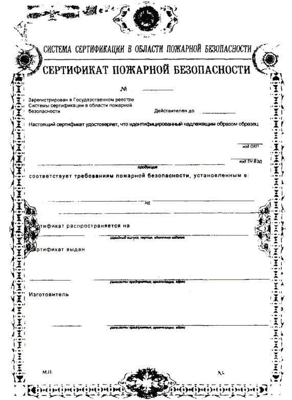 Маркировка товара и технической документации, прилагаемой к каждой единице продукции, осуществляется знаком соответствия ССПБ, наносимым на каждое изделие, его тару, упаковку, товаросопроводительную документацию в соответствии с требованиями ___________________________________________________________________________ Описание местонахождения знака соответствия ___________________________________________________________________________ В случае невыполнения условий, лежащих в основе выдачи сертификата, он отменяется (приостанавливается) органом по сертификации, выдавшим сертификат Сертификат выдан ___________________________________________________________________________ наименование органа по сертификации, выдавшего сертификат, № в Госреестре, адрес Руководитель органа по сертификации _____________ _________________ подпись инициалы, фамилия Эксперт _____________ _________________ подпись инициалы, фамилия м.п. Настоящий сертификат подтверждает соответствие продукции установленным требованиям пожарной безопасности и является необходимым документом для получения разрешения на ввоз продукции на территорию Российской Федерации. |