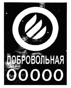 Знак содержит: изображение знака ССПБ, код органа по сертификации, выдавшего сертификат пожарной безопасности, и дополнительный элемент - "Добровольная".
