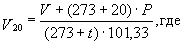 а - содержание вещества в анализируемом объеме раствора пробы, найденное по градуировочному графику, мкг; V - объем воздуха, отобранного для анализа и приведенного к стандартным условиям, л (см. приложение 1). Методические указания разработаны ВНЦБАВ, Одесским НИИ стоматологии. Приложение 1Приведение объема воздуха к стандартным условиям (температура 20 °С и давление 760 мм рт. ст.)проводят по формуле