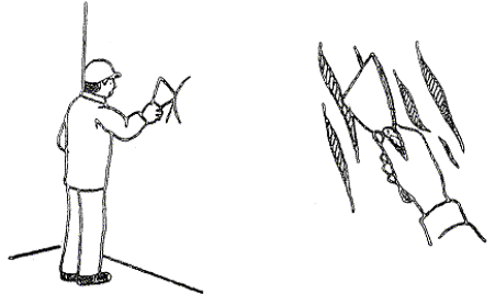 2.4. К окраске допускается подготавливать поверхности строительных конструкций и места их сопряжений (углы, примыкания, стыки), не имеющие отклонений от проектного положения, приведенных в табл. 1, а также сквозных и усадочных трещин, раскрытых на ширину более 3 мм. Количество местных дефектов (раковин, наплывов, впадин) на любом участке поверхности площадью 200×200 мм не должно превышать пяти. 2.5. Поверхности, подлежащие подготовке к окраске, не должны иметь загрязнений, пятен и высолов. Поверхности изделий индустриального изготовления должны удовлетворять требованиям стандартов на эти изделия. Оштукатуренные конструкции не должны иметь отслоений штукатурки от поверхности конструкций, следов затирочного инструмента, потоков раствора. Поверхности, облицованные листами сухой гипсовой штукатурки не должны иметь: нарушений креплений листов; отслоений картона от гипса с торца листа на величину более 20 мм; надрывов картона с обнажением гипса на длину более 30 мм; более двух отбитых углов в стыке листов по всей поверхности и более одного отбитого угла в одном стыке. Поверхности, облицованные асбестоцементными листами, подлежащие подготовке к окраске, не должны иметь околов, сдиров, наплывов, искривлений. 2.6. При подготовке поверхностей к окраске должны выполняться следующие технологические операции: очистка поверхности; огрунтовка очищенной поверхности; заполнение трещин и раковин; частичное подмазывание неровностей на поверхности; шлифование подмазанных мест; первая сплошная шпатлевка; шлифовка; вторая шпатлевка, шлифовка. 2.7. Очищают поверхности и трещины на ней от пыли, грязи, брызг и потоков раствора с помощью металлических скребков, лещадью, искусственной пемзой, закрепленной в обойму, или шарнирной теркой (рис. 1, 2). Жировые пятна промывают 2 %-ным раствором соляной кислоты с помощью кисти. Высолы на поверхности сметают щетками, промывают очищенные места и просушивают поверхность до влажности не более 8 %. Мыловарную грунтовку на строительном объекте готовят из концентрированной основы (студня), выпускаемой комбинатом «Стройдеталь» треста Мосотделпром в виде брикетов массой 1 кг. При растворении студня в воде должна образовываться однородная, без осадков жидкая грунтовка. Студень используется в течение 10 дней в летних и 20 дней в зимних условиях. Для приготовления грунтовки одну весовую часть студня нарезают, заливают двумя частями подогретой воды. Затем состав перемешивают до полного растворения студня, добавляют 3 части холодной воды и снова тщательно перемешивают. Перед употреблением грунтовку процеживают через сито с 625 отв/см2. Грунтовка должна быть однородной, без следов расслоения и нерастворившихся кусочков мыла. Наносят грунтовочный состав механизированным способом с помощью электрокраскопульта. Для получения равномерного слоя грунтовки удочку передвигают вдоль поверхности на расстоянии 0,75 м от нее, делая одновременно плавные круговые движения по спирали. При небольших объемах работ грунтовку наносят с помощью кистей-макловиц. 2.9. Большие трещины расшивают (рис. 3), расчищают и обеспыливают, затем заполняют шпатлевкой на глубину не менее 2 мм, а раковины и неровности заполняют шпатлевкой и сглаживают с помощью металлического шпателя «на сдир» (рис. 4). Зашпатлеванные места зачищают и шлифуют шлифовальной шкур