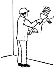 2.13. Поверхности, подготовленные к окраске, должны проверяться в любом месте, но не менее, чем в трех местах на наличие неровностей и местных дефектов. Окраска поверхностей строительных конструкций внутри помещений клеевой краской 2.14. Окраска поверхностей должна выполняться готовыми к применению красками промышленного или централизованного приготовления. 2.15. Нанесение каждого последующего слоя краски выполняется только после просушки предыдущего слоя. Цвет и вид окраски поверхности строительных конструкций должны соответствовать проекту. 2.16. При окраске поверхностей клеевыми красками должны выполняться следующие технологические операции: вторая огрунтовка поверхностей; окраска. 2.17. Вторая огрунтовка и окраска выполняются способом, аналогичным указанному в пункте 2.8. Вторая огрунтовка должна осуществляться краской, имеющей цвет последнего слоя краски. Окраска поверхностей должна производиться ровным слоем без пропусков и потеков (рис. 6). 2.18. Водно-меловой колер приготовляют на строительном объекте из меловой пасты 30-35 %-ной влажности и воды (добавлять до рабочей консистенции). Меловую пасту выпускает комбинат «Стройдеталь» треста Мосотделпром в соответствии с ТУ 400-2-88-76. В пасте не должно быть нерастертых кусочков мела, а также песчинок и другого засорения. Влажность пасты не более 35 %. 2.19. На поверхностях, окрашенных клеевой краской, не допускается разнотонность в пределах одной плоскости, выделение на общем фоне полос, пятен, потеков, брызг и видимых исправлений дефектов. Бордюры и фризы должны иметь одинаковую ширину на всем протяжении. Клеевую окраску стен и потолков необходимо выполнять с соблюдением требований СНиП III-4-80 «Техника безопасности в строительстве». Особое внимание следует обращать на следующее: малярные работы на высоте должны выполняться с инвентарных лесов-подмостей, стремянок, универсальных столиков-козелков, передвижных вышек и других инвентарных приспособлений. При производстве работ на лестничных маршах необходимо применять специальные подмости (столики) с разной длиной опорных стоек, устанавливаемых на ступени. Рабочий настил должен быть горизонтальным и иметь ограждение. Женщинам разрешается переносить груз, масса которого не превышает 15 кг. Складировать малярные материалы разрешается только в специально предусмотренных местах в соответствии с ППР. При приготовлении малярных составов с помощью краскотерки необходимо принимать следующие меры предосторожности: не допускать перегрева электродвигателя во время работы краскотерки; не оставлять работающую краскотерку без присмотра и не допускать к работе на ней лиц, не прошедших специального обучения. К работе с электрифицированным инструментом допускаются лица не моложе 18 лет, прошедшие специальное обучение и получившие удостоверение на право работы с этими инструментами. При очистке поверхности, шлифовке и механизированной окраске необходимо пользоваться защитными очками. При промывке поверхностей раствором соляной кислоты рабочие должны пользоваться защитными очками, резиновыми сапогами и перчатками. Разводят кислоту, медленно вливая ее в воду. При окраске водными составами необходимо следить, чтобы электропроводка на месте работ была обесточена. 2.20. Фронт малярных работ делят на захватки. Размер захватки определяет
