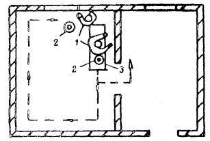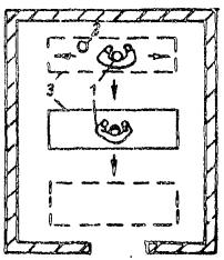 Огрунтовка и клеевая окраска кистью: 1 - маляры; 2 - емкость с краской; 3 - столик-подмости