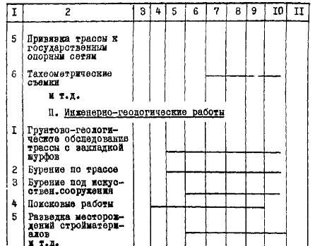 Примечания: 1) При подробных изысканиях: - инженерно-технические работники изыскательской партии обязаны уметь выполнять все виды топографо-геодезических работ и заменять друг друга в необходимых случаях; - количество инженеров и старших техников-геологов зависит от объема инженерно-геологических работ по трассе, мостовым переходам и месторождениям дорожностроительных материалов; - лаборант включается в партию при отсутствии лаборатории в штабе экспедиции; - при выполнении буровых работ отдельным буровым отрядом буровой мастер в изыскательскую партию не включается; - старший техник по топографическим съемкам и техник по съемке поперечников включаются в состав партии при выполнении изыскании в условиях горного или пересеченного рельефа местности; - техник по съемке поперечников включается при изысканиях для реконструкции существующих дорог. 2) При производстве изыскательских работ по реконструкции автомобильной дороги в состав партии включается инженер-мостовик по обследованию существующих искусственных сооружений. 3) Группы рабочего проектирования при предпостроечных изысканиях формируются в зависимости от сроков и объема работ. 4) При небольшом объеме и несложных условиях изыскательских работ могут быть организованы отдельные дорожные или геологические отряды или объединенные дорожно-геологические отряды. Состав отрядов зависит от объема и сроков работ. 5) При работе в необжитой, труднодоступной местности (таежной, горно-таежной и др.), где невозможно передвижение автотранспорта, изыскательским партиям придается вьючный транспорт (по потребности), с соответствующим числом погонщиков, а также проводник из числа местных жителей. III. ПРАВА И ОБЯЗАННОСТИ НАЧАЛЬНИКА ИЗЫСКАТЕЛЬСКОЙ ЭКСПЕДИЦИИ§ 15. Изыскательская экспедиция возглавляется начальником экспедиции, который назначается приказом проектной организации по представлению начальника ведущего отдела (выполняющего основной объем проектно-изыскательских работ по данному объекту), согласованному с руководством проектной организации. § 16. Начальник экспедиции является материально-ответственным лицом, который по месту работ представляет интересы проектной организации и несет полную ответственность за всю деятельность экспедиции. § 17. Все административные и технические распоряжения начальника экспедиции обязательны для всех работающих в экспедиции. В полевых условиях разногласия между сотрудниками экспедиции разрешаются начальником экспедиции. Разногласия по техническим вопросам между начальником экспедиции и его подчиненными разрешаются главным инженером проекта. § 18. Начальник экспедиции подчиняется в своей производственной деятельности начальнику ведущего отдела, в технической деятельности - главному инженеру проекта, а в отношении учета отчетности и финансирования - главному бухгалтеру проектной организации. § 19. Начальник изыскательской экспедиции имеет право: а) участвовать в составлении технического задания, выдаваемого экспедиции; б) формировать состав экспедиции; в) издавать приказы и распоряжения по экспедиции; г) в полевых условиях вести переписку по вопросам работы экспедиции с различными организациями и местными органами власти; д) участвовать от имени проектной организации в совещаниях и комиссиях по вопросам, связанным 
