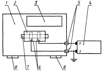 1 - гигростатируемая измерительная камера; 2 - электродное устройство; 3 - устройство для сушки (стабилизации влажности) воздуха; 4 - мегаомметр; 5 - проходные изоляторы; 6 - электроды (4 шт.), соединенные попарно (верхний с нижним) гибкими проводами в две группы, подключаемые к мегаомметру; 7 - образец ленты, помещенный в электродное устройство; 8 - окна с укрепленными резиновыми перчатками для выполнения работ в измерительной камере без нарушения ее герметичности Рисунок Б.1 - Схема прибора УГЭ-2