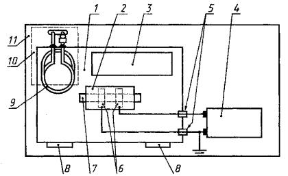 1 - гигростатируемая измерительная камера; 2 - электродное устройство; 3 - устройство для осушения (стабилизации влажности) воздуха; 4 - мегаомметр; 5 - проходные изоляторы (клеммные); 6 - электроды, соединенные попарно (верхний с нижним) гибкими проводами в две группы, подключаемые к мегаомметру; 7 - образец ленты, помещенный в электродное устройство; 8 - окна с укрепленными резиновыми перчатками для выполнения работ в измерительной камере без нарушения ее герметичности; 9 - змеевик-охладитель; 10 - автоматический агрегат; 11 - стол Рисунок Б.2 - Схема прибора УГЭ-2М