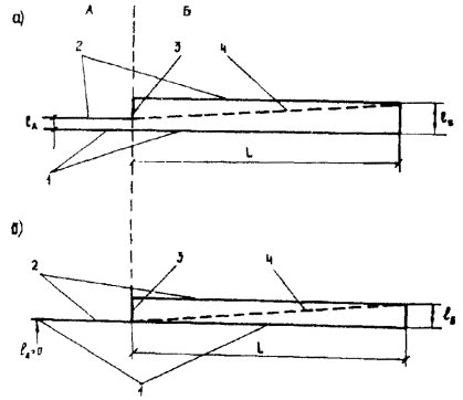 участков А и Б, склонных к пучению (а) и на границе непучинистого участка А с пучинистым участком Б (б): 1.2. Конструкция теплоизолирующего или морозозащитного слоя должна иметь клиновидную форму и обеспечивать как величину зимнего поднятия покрытия на концах сопрягаемых участков, необходимую для сохранения ровности проезжей части, так и требуемый продольный уклон. 1.3. В случае, если один участок пучинистый, а другой непучинистый, то клиновидную переходную конструкцию устраивают на пучинистом участке, а если оба участка пучинистые, то на том, где ожидается большее поднятие покрытия. 1.4. Применительно к различным вариантам сопряжения смежных участков с разной высотой пучения разработан метод теплотехнического расчета размеров клиновидной конструкции. 1.5. Клиновидную переходную конструкцию в местах сопряжения смежных участков проектируют одновременно с теплоизолирующим или морозозащитным слоем на основном протяжении дороги, так как принципы теплотехнического расчета в обоих случаях одинаковы. При проектировании конструкции следует руководствоваться указаниями настоящих «Методических рекомендаций», а также «Методических рекомендаций» [1, 2]. 2. Требования к сопряжениям2.1. Для обеспечения требуемых эксплуатационных качеств дороги переход от одного смежного участка к другому должен быть как можно более плавным, а неравномерное поднятие покрытия не должно превышать допустимой величины. 2.2. Для удовлетворения требований п. 2.1 необходимо, чтобы разница зимнего поднятия покрытия на сопрягаемых участках lА и lБ не превышала допустимых значений пучения конструкции lдоп, см. [3], т.е. lБ - lА ≤ lдоп, а неравномерность пучения iдоп, т.е. отношение разницы поднятия lдоп к протяжению переходного участка сопряжения L, не превосходила величин, указанных в таблице.