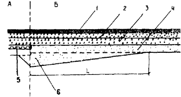 Примечание. Неравномерность пучения 1 мм/м соответствует уклону поверхности покрытия 1 ‰. 2.3. Длину теплоизолирующего клина L, м, для обеспечения требуемого уклона поверхности покрытия на переходном участке следует определять по формуле где 10 - переводной коэффициент. Величина iдоп приведена в таблице. 2.4. Ширина клиновидной конструкции сопряжения должна быть равной ширине устраиваемого на дороге теплоизолирующего или морозозащитного слоя, т.е. конструкция может частично располагаться и под обочиной. 3. Материалы для устройства сопряжений3.1. Клиновидную конструкцию сопряжения смежных участков можно устраивать из тех же материалов, что и морозозащитный слой на основном протяжении дороги: из теплоизоляционных, обладающих малой теплопроводностью материалов (пенопласт, керамзит, легкие бетоны и др.), и морозозащитных, не изменяющих своего объема при промерзании (гравий, песок, щебень, шлаки и пр.). Требования к качеству материалов для устройства переходных конструкций и для слоев на основном протяжении дороги одинаковы [1, 2]. 3.2. При использовании теплоизоляционного материала в форме плиты (пенопласт, торфоплита и др.) необходим достаточный запас тонких плит (≈ 1 - 2 см), позволяющих постепенно изменять толщину теплоизолирующего слоя по длине клиновидной конструкции. 4. Конструкции сопряжений4.1. В случае сопряжения смежных участков, один из которых имеет теплоизолирующий слой из пенопласта, достаточный для полного предотвращения промерзания и пучения земляного полотна, а на другом, не имеющем такого слоя, ожидается некоторое пучение, переходную конструкцию можно устраивать из пенопласта. Плиты пенопласта укладывают в несколько слоев с перекрытием швов нижележащих плит верхними плитами. В поперечном профиле дороги плиты выпускают за край проезжей части под обочину на 1,2 м с уменьшением на половину толщины теплоизолирующего слоя на расстоянии 0,6 м от края проезжей части. В продольном направлении дороги общее протяжение переходного участка, на котором число плит пенопласта постепенно уменьшается, составляет не менее 15 м. 4.2. В случае сопряжения смежных участков, на одном из которых предусмотрены меры по полному предотвращению пучения (участок А), а на другом (участок Б) ожидается пучение, возможно также применение переходной клиновидной конструкции, устраиваемой из традиционного морозозащитного материала (рис. 2). Клиновидную конструкцию рассчитывают так, чтобы на одном конце ее (конец участка А) промерзание земляного полотна было полностью предотвращено, а на другом конце, на расстоянии L, м, на участке Б промерзание было ограничено, и ожидаемое поднятие покрытия не превышало допустимой величины. Длину переходной конструкции L назначают таким образом, чтобы продольный уклон вспученной поверхности покрытия на сопряжении не превысил допустимой величины (см. таблицу). Рис. 2. Сопряжение участков (lА = 0; lБ = m) с помощью клиновидной конструкции из морозозащитного материала: 1 - асфальтобетон I марки; 2 - то же, III - IV марок; 3 - щебень; 4 - песок; 5 - пенопласт; 6 - клиновидная конструкция Рис. 3. Клиновидная конструкция на подходе к мосту из материалов теплоизоляционного (а) и морозозащитного (б): 1 - асфальтобетон I марки; 2 - то же, III - IV марок; 3 - теплоизолирующий слой из битумоцементогрунта с пористым заполнителем; 4 - песок средней крупности; 5 - кл