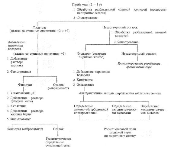 Дата введения 2001-07-01 1 Общие требования1.1. Область примененияНастоящий стандарт распространяется на бурые и каменные угли, антрациты, лигниты, торф, кокс и горючие сланцы (далее - топливо) и устанавливает методы определения массовых долей сульфатной, пиритной и органической серы. Дополнительные требования, отражающие потребности экономики страны, выделены курсивом. 1.2. Нормативные ссылкиВ настоящем стандарте использованы ссылки на следующие стандарты: ГОСТ 199-78 Натрий уксуснокислый 3-водный. Технические условия ГОСТ 1277-75 Серебро азотнокислое. Технические условия ГОСТ 1770-74 Посуда мерная лабораторная стеклянная. Цилиндры, мензурки, колбы, пробирки. Технические условия ГОСТ 2059-95 (ИСО 351-84) Топливо твердое минеральное. Метод определения общей серы сжиганием при высокой температуре ГОСТ 3118-77 Кислота соляная. Технические условия ГОСТ 3760-79 Аммиак водный. Технические условия ГОСТ 4108-72 Барий хлорид 2-водный. Технические условия ГОСТ 4145-74 Калий сернокислый. Технические условия ГОСТ 4204- 77 Кислота серная. Технические условия ГОСТ 4220-75 Калий двухромовокислый. Технические условия ГОСТ 4461-77 Кислота азотная. Технические условия ГОСТ 4478-78 Кислота сульфосалициловая 2-водная. Технические условия ГОСТ 4919.1-77 Реактивы и особо чистые вещества. Методы приготовления растворов индикаторов ГОСТ 5456-79 Гидроксиламина гидрохлорид. Технические условия ГОСТ 6613-86 Сетки проволочные тканые с квадратными ячейками. Технические условия ГОСТ 8606-93 (ИСО 334-92) Топливо твердое минеральное. Определение общей серы. Метод Эшка ГОСТ 9147-80 Посуда и оборудование лабораторные фарфоровые. Технические условия ГОСТ 10398-76 Реактивы и особо чистые вещества. Комплексонометрический метод определения содержания основного вещества ГОСТ 10652-73 Соль динатриевая этилендиамин - N, N, N`, N`-тетрауксусной кислоты 2-водная (трилон Б) ГОСТ 10678-76 Кислота ортофосфорная термическая. Технические условия ГОСТ 10742-71 Угли бурые, каменные, антрацит, горючие сланцы и угольные брикеты. Методы отбора и подготовки проб для лабораторных испытаний ГОСТ 10929-76 Водорода пероксид. Технические условия ГОСТ 11303-75 Торф и продукты его переработки. Метод приготовления аналитических проб ГОСТ 11305-83 Торф. Методы определения влаги ГОСТ 12026-76 Бумага фильтровальная лабораторная. Технические условия ГОСТ 23083-78 Кокс каменноугольный, пековый и термоантрацит. Методы отбора и подготовки проб для испытаний ГОСТ 25336-82 Посуда и оборудование лабораторные стеклянные. Типы, основные параметры и размеры ГОСТ 27313-95 (ИСО 1170-77) Топливо твердое минеральное. Обозначения показателей качества и формулы пересчета результатов анализа для различных состояний топлива ГОСТ 27314-91 (ИСО 589-81) Топливо твердое минеральное. Методы определения влаги ГОСТ 27589-91 (ИСО 687-74) Кокс. Метод определения влаги в аналитической пробе ГОСТ 29169-91 Посуда лабораторная стеклянная. Пипетки с одной отметкой ГОСТ 29252-91 Посуда лабораторная стеклянная. Бюретки без времени ожидания 1.3 Сущность методовМетоды определения форм серы основаны на различной растворимости сульфатов и пиритов в растворах соляной и азотной кислот в определенных условиях. Сущность методов заключается в последовательном переведении сульфатов и пиритов в раствор и их прямом определении. Общая схема анализа приведена на рисунке 1.