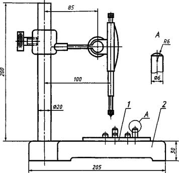 огнеупорных изделий при нагреве А.1 Область применения Настоящий международный стандарт устанавливает два метода определения остаточных изменений размеров плотных огнеупорных изделий при нагреве. Метод не распространяется на углеродсодержащие изделия. (Поправка. ИУС 9-2001 г.). А.2 Нормативные ссылки В настоящем стандарте использованы ссылки на следующие стандарты: ИСО 5017-88 Плотные огнеупорные изделия. Определение кажущейся плотности, открытой и общей пористости ИСО 5022-79 Огнеупорные изделия. Отбор образцов и приемочные испытания А.3 Определения А.3.1 В настоящем стандарте применяют следующие термины с соответствующими определениями. А.3.1.1 остаточное изменение размеров при нагреве: Рост или усадка огнеупорного изделия, нагретого до определенной температуры в течение установленного времени и охлажденного затем до температуры окружающей среды. А.3.1.2 плотное огнеупорное изделие: Огнеупорное изделие с общей пористостью менее 45 % (по объему), определяемой по ИСО 5017. А.4 Сущность метода Из каждого изделия вырезают образец в форме прямоугольного параллелепипеда или цилиндра, высушивают и измеряют линейные размеры (метод 1) или объем (метод 2). Образец нагревают в печи в окислительной среде при заданной скорости нагрева до определенной температуры, которую поддерживают в течение определенного времени. После охлаждения образца до температуры окружающей среды измерения повторяют и вычисляют изменение линейных размеров или объема. А.5 Аппаратура А.5.1 Электрическая или газовая печь, обеспечивающая нагрев образцов в окислительной среде при заданной скорости нагрева, а также их выдержку при температуре испытания в течение определенного времени. А.5.2 Устройства для измерения температуры. А.5.2.1 Термопары (не менее трех) для измерения температуры и распределения ее в пространстве, занимаемом образцами. Примечание - В комплекте с термопарами используют прибор для непрерывной записи температуры, регистрирующий зависимость «температура - время». А.5.3 Устройство для измерения линейных размеров, состоящее из индикатора часового типа или микрометра с точностью до 0,01 мм, установленного на стенде с отшлифованной опорной плитой (рисунок А.1) и подставкой (рисунок А.2) с тремя опорными и двумя установочными штифтами диаметром 6 мм. Нижняя поверхность подставки должна быть отшлифована. Для симметричного расположения на штифтах призматического образца в одном из его углов наносят диагональную отметку. Для калибровки устройства используют цилиндр определенных размеров. Измеряют образец, установленный на подставку, до и после нагрева в одних и тех же точках на его поверхности с помощью индикатора часового типа или микрометра. А.5.4 Устройство для измерения объема, работающее по принципу вытеснения воды Общий объем определяют в соответствии с ИСО 5017. А.5.5 Сушильный шкаф с отверстиями для обеспечения эффективной вентиляции. А.6 Образцы для испытания А. 6.1 Отбор изделий (образцов) Количество образцов для испытаний устанавливают в соответствии с ИСО 5022 по соглашению сторон. А.6.2 Подготовка образцов Из каждого изделия вырезают один образец. Образцы должны иметь форму прямоугольного параллелепипеда размером (50´50´(60 ± 2)) мм или цилиндра диаметром 50 мм и высотой (60 ± 2) мм. Примечания 1 Допускается вырезать большее количество образцов, если позволяет разме