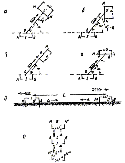 Условия применения однополюсного зондирования те же, что и симметричного ВЭЗ. Кроме того, этот метод дает лучшие результаты, когда необходимо определить мощность слоя, выклинивающегося на некотором расстоянии от точки зондирования или зондирование приходится проводить вблизи выхода контакта пород. В этих случаях однополюсное зондирование проводится в двух противоположных направлениях, если топографические условия не ограничивают возможности такого двухстороннего однополюсного зондирования (комбинированного зондирования). ВЭЗ производится в нескольких точках по профилю, при фиксированном положении электрода в «бесконечности». Круговое ВЭЗ Зондирование, проводимое в одной точке в разных азимутах называют круговым ВЭЗ. Значения ρк рассчитываются по формуле симметричного или однополюсного ВЭЗ, в зависимости от вида применяемого зондирования. Круговое ВЭЗ применяется при изучении трещиноватости и при изучении карста. Дипольное ВЭЗ Отличается от обычного зондирования тем, что расстояние между питающими электродами, а также между приемными значительно меньше, чем расстояние между средними точками этих двух пар. Дипольное ВЭЗ подразделяется на следующие виды: азимутальное, если ось диполя MN перпендикулярна линии ОО’, соединяющей центры диполей; перпендикулярное, если оси диполей АВ и MN взаимно перпендикулярны; радиальное, когда диполь MN расположен вдоль линии ОО’; параллельное - при расположении диполей АВ и МN параллельно друг другу; осевое, если ось диполя MN находится на продолжении оси диполя АВ; экваториальное - при расположении осей диполей АВ и МN параллельно друг другу и одновременно перпендикулярно к ОО’ (рис. 1). Рис. 1. Схема дипольного ВЭЗ а) дипольное азимутальное зондирование; б) дипольное перпендикулярное зондирование; в) дипольное радиальное зондирование; г) дипольное параллельное зондирование; д) дипольное осевое зондирование; е) дипольное экваториальное зондирование. Из перечисленных наиболее простыми являются осевая и экваториальная установки. Значения ρк для осевой установки рассчитываются по формуле: