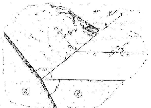 При однополюсном ВЭЗ питающий электрод «А» передвигается вниз по склону, когда точки наблюдения располагаются в верхней половине хребта и передвигается вверх, когда точки находится в нижней половине склона. Электрод «В» относится в обоих случаях вдоль склона на расстояние, равное 10 - 15 АОmах. В середине склона направление линии питания можно брать в произвольном азимуте, если АОmax не пересекает гребень хребта или подошву склона, а также линию контакта между породами (см. рис. 11, - «ВЭЗ с произвольным азимутом»). Измерения надо начинать с вспомогательного створа; электрод же «В» относить в сторону от створа проектируемого тоннеля. В этом случае место заземления электрода «В» не меняется для всех точек ВЭЗ, расположенных на одном поперечнике проектируемого тоннеля. При переходе на следующий поперечник электрод «В» переносится в том же направлении на расстояние, равное расстоянию между поперечниками ВЭЗ. § 89. Значения ρк при однополюсном ВЭЗ вычисляются по формуле: