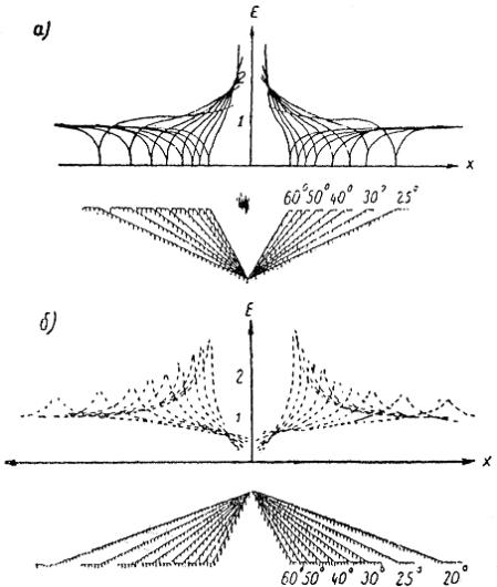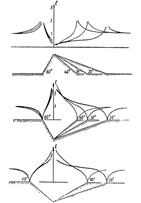 По оси ординат отложены значения Рис. 3. Палетки Е для долин (а) и хребтов (б) с поперечным сечением формы симметричного треугольника. Рис. 4. Палетки Е для долин и хребтов с поперечным сечением формы асимметричного треугольника. Палетки Е пригодны для интерпретации кривых ρк комбинированного профилирования, когда АО >> МN, а также профилирования симметричной установкой, когда АВ >> МN. Ими легко пользоваться. Для этого надо топографический разрез вдоль профиля совместить с подходящим треугольником. Если экспериментальная кривая электропрофилирования следует ходу соответствующей теоретической, аномалия обусловлена влиянием рельефа и полностью исключается; если же она отклоняется от хода теоретической кривой, то аномалия, помимо влияния рельефа, обусловлена какими-то посторонними причинами, которые должны быть объяснены геологическим строением в данной точке. Пример. На рис. 5 представлены кривые ρк вдоль четырех профилей, пересекающих овраги. Нанесены соответствующие кривые Е и топографические разрезы вдоль профилей. За ось абсцисс, на которую асимптотически выходят ветви палетки Е, принята прямая, отсекающая на оси ординат значение ρк - 125 омм. Это значение представляет собой среднее кажущееся сопротивление пород в той части участка, где кривая не искажена оврагом. Выбор асимптотического значения Е, следовательно, обуславливается видом кривой в ее неискаженной части. Выбор значения L также несколько условный. Нельзя утверждать, что овраг начинается на концах отрезка L, так же как нельзя ожидать, что борт оврага будет сохранять неизменный угол наклона. Однако такой приближенный метод подбора треугольника и соответствующей кривой палетки Е, как показывает практика полевых работ, дает достаточно хорошие результаты при интерпретации кривых электропрофилирования. Рис. 5. Пример применения палетки Е. Палетки Е не рассчитаны для угловых точек контура, в частности для дна долины. В этом случае, следуя теории, получаем значение ρк = ∞. Практически же любой угол скруглен в разной степени*). Для определения значения ρк в точке, расположенной на дне долины, необходимо дополнить контур долины до треугольника, измерить расстояние от вершины треугольника до точки касания с контуром долины, определить величину превышения дна долины над вершиной треугольника и значения ρк рассчитать по таблице значений поправочных коэффициентов. *) М.Л. Лаврентьев и Б.В. Шабат. Методы теории функций комплексного переменного, стр. 180. Гос. изд. физ.-мат. литературы, М., 1958 г. ТАБЛИЦА значений поправочных коэффициентов