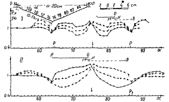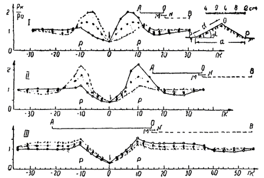 обратной установки; I -АО = ОВ =5,5 см = 0,5d; II - АО = ОВ = 10,5 см = Id. Рис. 7. Кривые ρк комбинированного и симметричного профилирования над хребтом с конечными склонами (a = 30°) (по А.С. Полякову) 0 - - - 0 ρк прямой установки; х - - - х ρк обратной установки; I - АО = ОВ = 10 см = 0,87d; II - АО = ОВ = 20 см = 1,7d; III - АО = ОВ = 40 см = 3,5d. Когда размеры симметричной