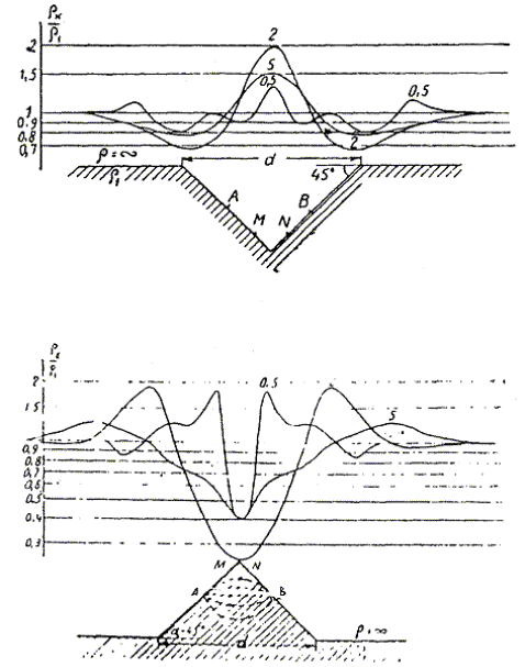 палетках нанесены цифры, обозначающие отношение Рис. 8. Экспериментальные палетки С.Г. Комарова и Л.П. Горбенко по учету влияния рельефа. При проведении ВЭЗ на хребте, когда электроды располагаются нормально к оси хребта, расчет кажущегося удельного электрического сопротивления для четырехточечной установки производится по формуле: