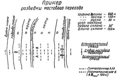 располагаются в створе мостового перехода и на параллельных профилях. В случае