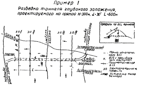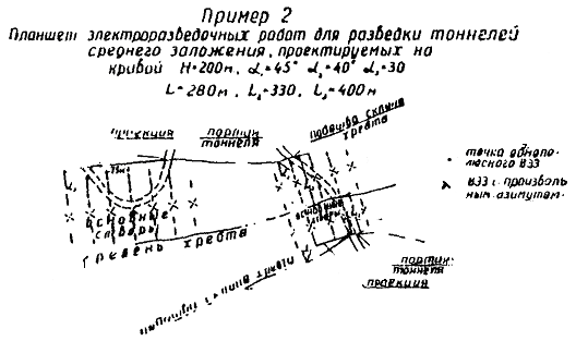 На расстоянии Недоучет вышеотмеченного может привести к очевидным ошибкам при интерпретации кривых электропрофилирования. Пример: пусть район работ представлен порфиритами (ρ1 = 400 омм). На некоторых участках встречаются слоистые известняки (ρ2 = 700 омм). Если проводится профилирование по профилям, ориентированным вдоль оси хребта, и затем сравниваются между собой графики ρк электропрофилирования, снятые по профилям у гребня, где ρк = 700 омм и по середине склона, где ρк = 400 омм, можно допустить ошибку, представив по завышенному значению ρк наличие шапки слоистых известняков над порфиритами. При профилировании нормально к оси хребта в значения ρк необходимо вносить количественную поправку на рельеф. Для этого используются теоретические палетки ρк/ρ0 профилирования трехэлектродной установкой, рассчитанные для различных значений углов у гребня хребта: 140°, 130°, 120°, 110° и 100°, когда АО = ОВ = 340 м и MN = 24 м (рис. 12). Рис. 12. Палетки ρк/ρ0 комбинированного профилирования, рассчитанные для различных значений ap у гребня хребта: 140°, 130°, 120°, 110° и 100°; АО = ОВ= 340 м, МN = 24 м. Электропрофиль направлен нормально к оси хребта. Для построения полевых кривых, сопоставимых с палетками, необходимо проводить измерения прямым (AMN) ходом, когда установка перемещается к гребню, т.е. приближать к гребню приемные электроды, а за ними - питающий электрод; при удалении же от гребня, наоборот, измерения проводить обратным ходом (МNB), т.е. от гребня удалять питающий электрод, а за ним - пару приемных электродов. § 93. Число электропрофилей равно числу точек ВЭЗ на вспомогательном створе, когда измерения проводятся вдоль оси хребта (таб. 4). Точки ВЭЗ другого вспомогательного профиля должны совмещаться с электропрофилями. При измерении нормально гребню число профилей меняется от 3 до 7, из которых три профиля соответствуют основному и двум вспомогательным створам, а остальные четыре (в зависимости от детальности исследования), распределяются: два - между вспомогательным и основным створами, по одному - вне полосы исследования. Размеры АО и МN, а также шаг измерения определяются по данным ВЭЗ. § 94. При работе методом ПС профили ориентируются вдоль хребта. Измеряется потенциал поля ПС. Протяженность профиля определяется шириной полосы исследования (§ 87). Расстояние между профилями: от 20 м до 40 м; между точками замеров - от 10 до 20 м. § 95. В случае проектирования тоннелей по кривой, необходимо добавлять число профилей и точек ВЭЗ. Ось тоннеля проектируется на склон хребта и по проекции определяется необходимость проведения добавочных профилей. Если длина проекции меньше 2/3 ширины полосы исследования, принятой в § 87 для разных глубин наложения тоннеля, изменения в подготовке электрометрического планшета не вносятся. Если же длина проекции меньше 4/3 и больше 2/3 ширины полосы исследования, добавляются два основных профиля, пересекающих проекцию от краев примерно на 1/3 длины. Вспомогательные профили прокладываются в последовательности, принятой в § 87. Если проекция дуги равна или больше удвоенной ширины исследования, все профили, пересекающие проекцию оси тоннеля, являются основными, вне проекции - вспомогательными. Число точек ВЭЗ на основных створах определяется таблицей 4; на вспомогательных 1:2 - 1:3 к количеству ВЭЗ по основному створу (рис. 13). Рис. 13. Исследование оползней§ 96. Целью эл