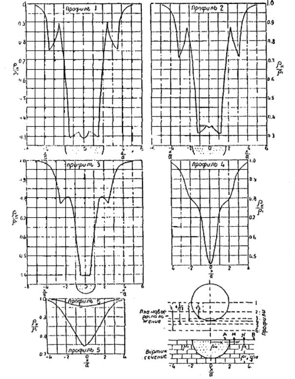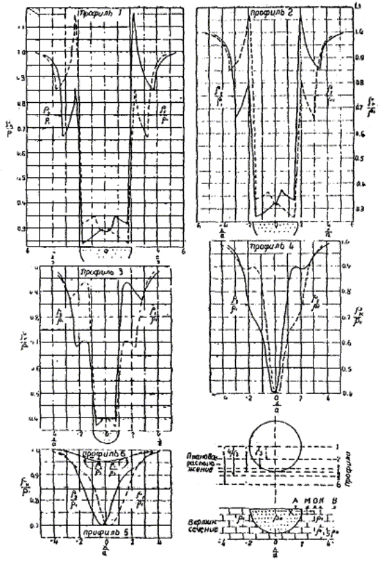 кривая Рис. 17. Сопоставление теоретической и экспериментальной кривых электропрофилирования установкой Веннера, когда электропрофиль проходит по диаметру заполненной воронка полусферической формы