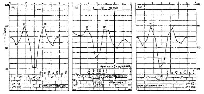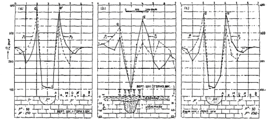 электропрофиль проходит по диаметру заполненной воронки полусферической формы (а) - теоретическая кривая; (b) - кривая по данным полевых замеров на фоне геологического разреза; (с) - теоретическая кривая по точкам наблюдения. Рис. 16. Теоретическая